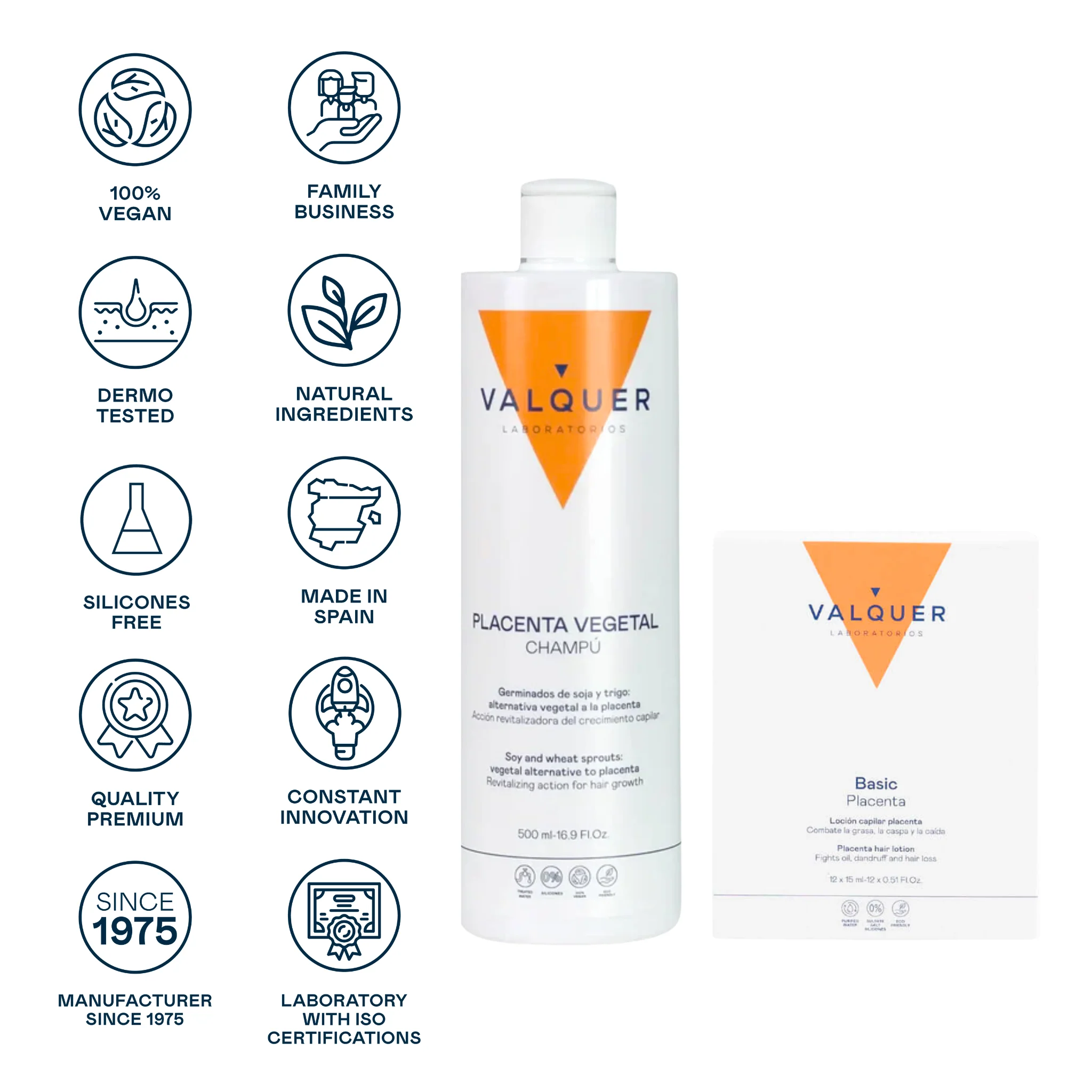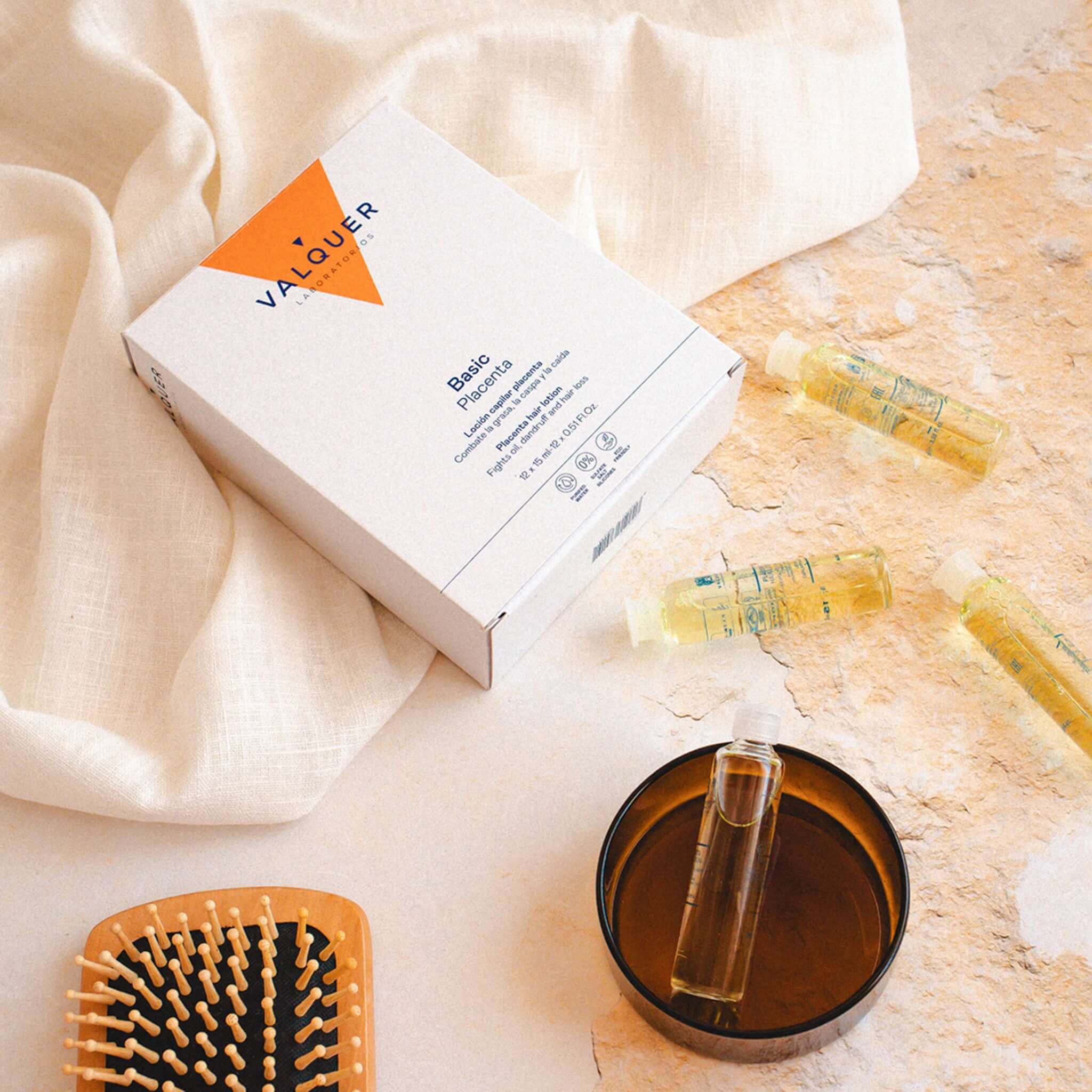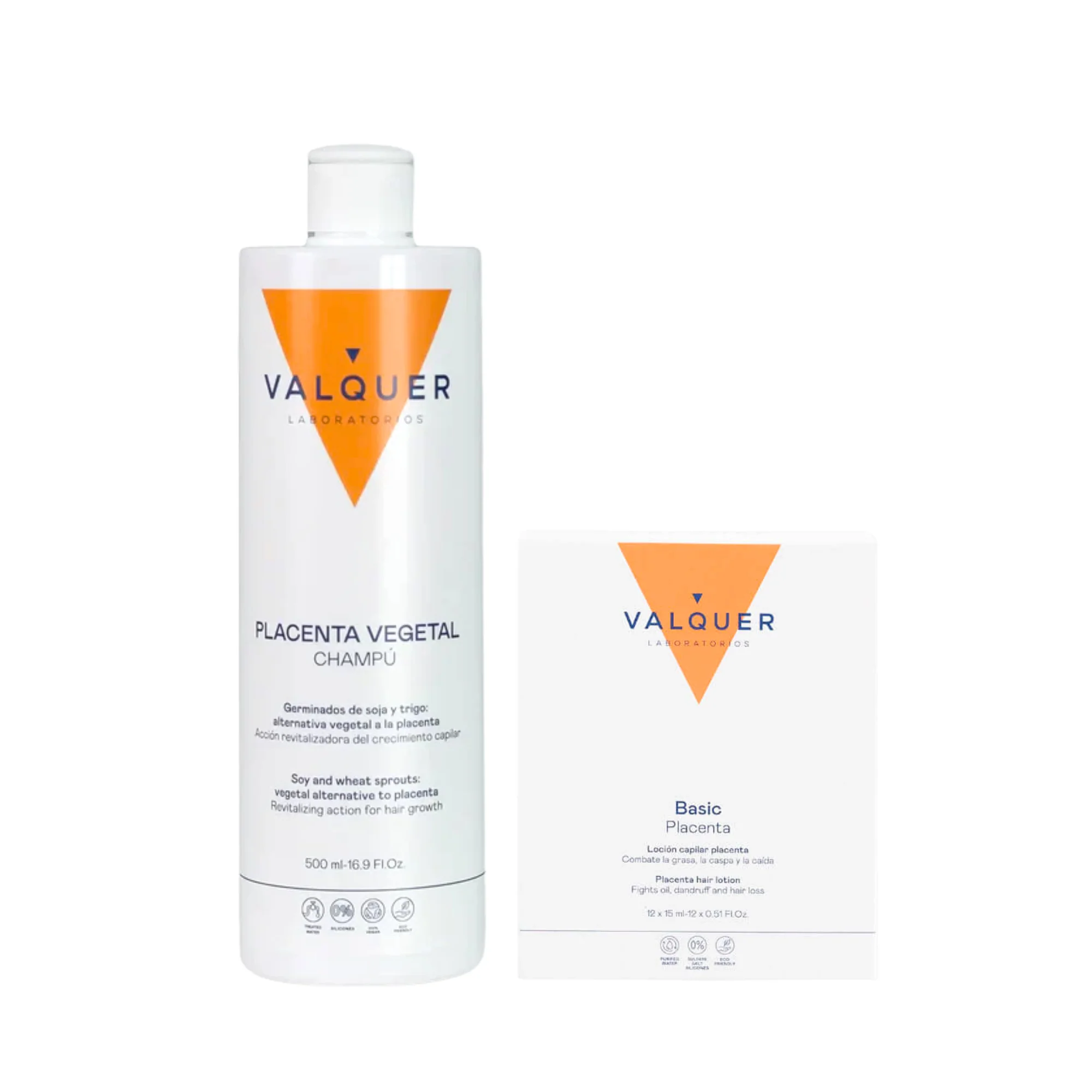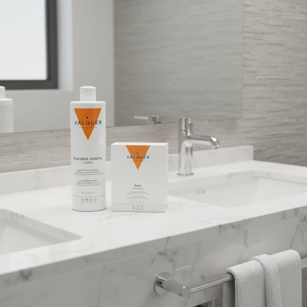 El Champú de Placenta Vegetal (500 ml) limpia profundamente, combate la caspa, la grasa y reduce la caída del cabello al nutrir el cuero cabelludo, mientras que la Loción Capilar en ampollas (12 × 15 ml) actúa como tratamiento intensivo, revitalizador y tonificante natural gracias a su acción directa sobre los folículos.